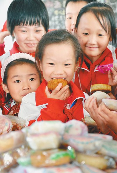 2012年9月30日,山东省沂源县的留守儿童收到“爱心月饼”。赵东山摄