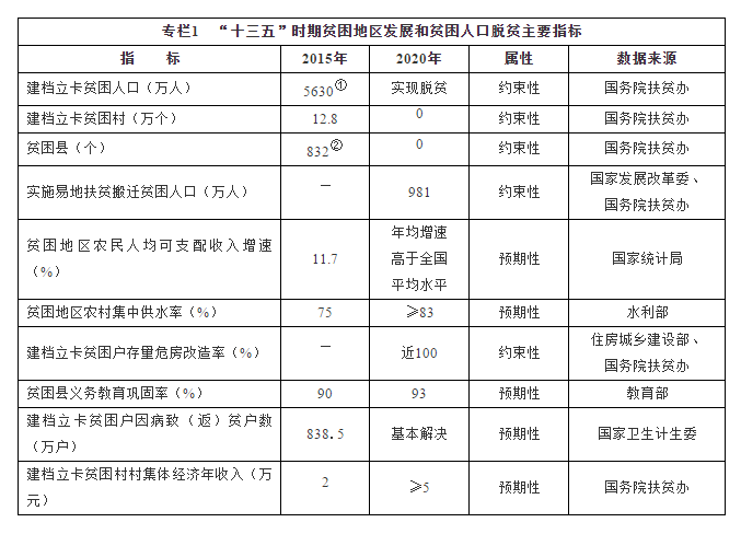 专栏1 “十三五”时期贫困地区发展和贫困人口脱贫主要指标